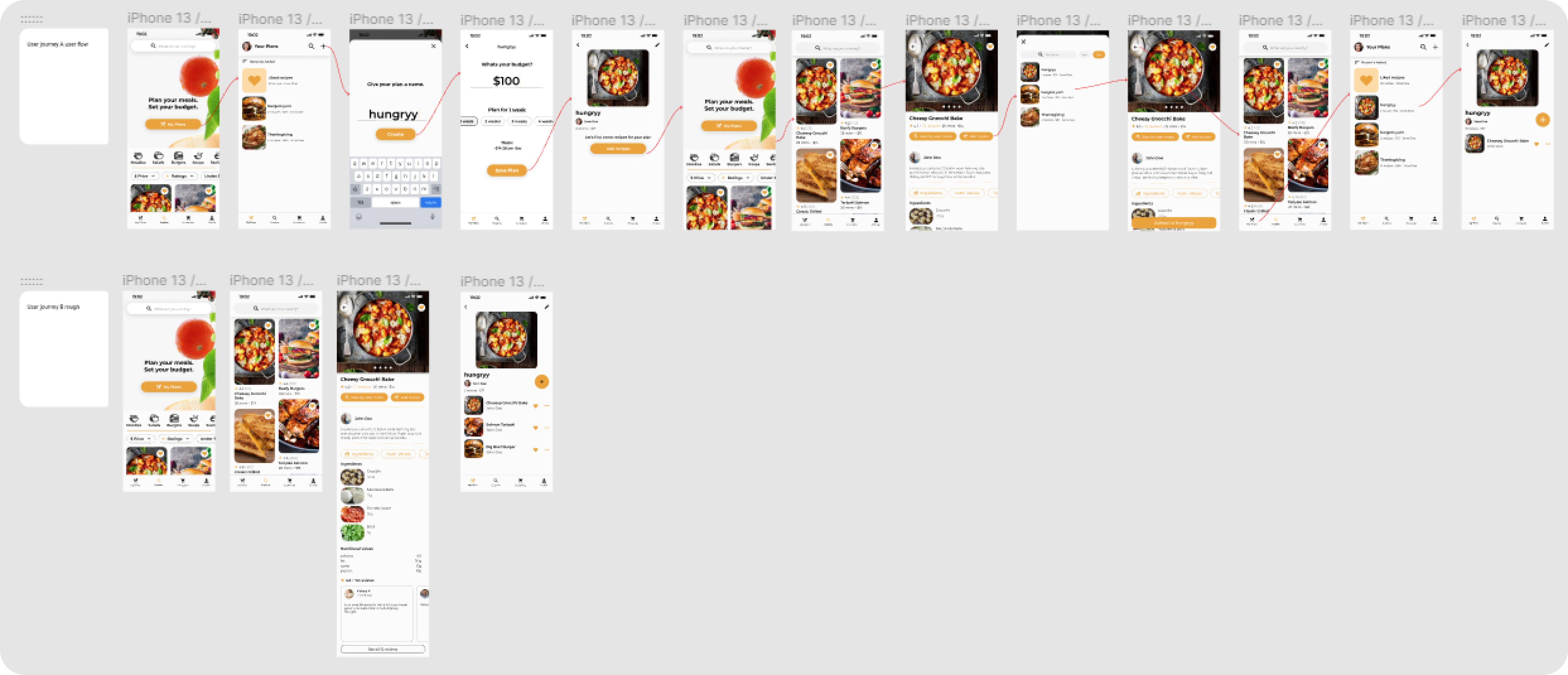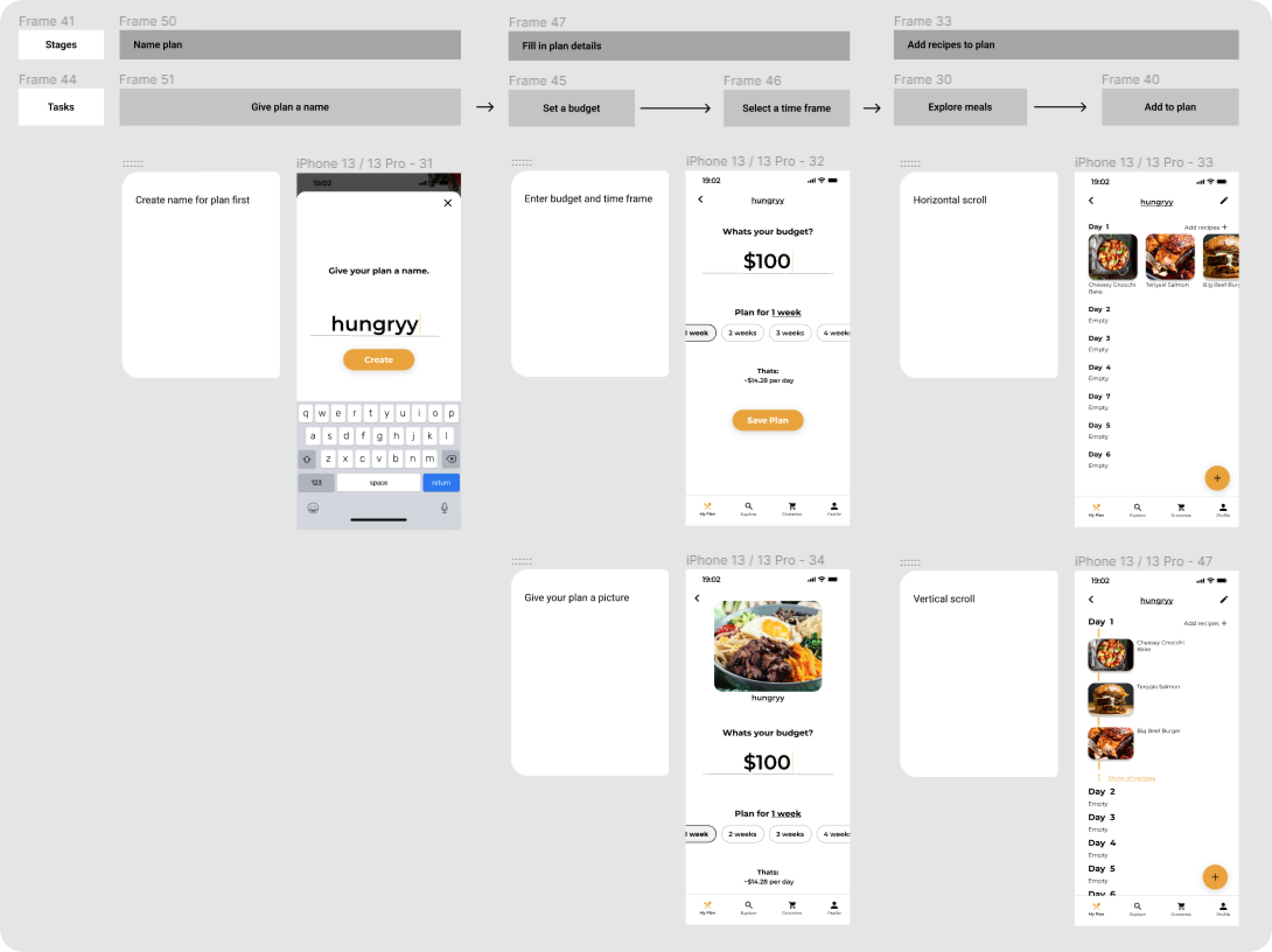 After narrowing down the problem to solve for, I competitively analyzed similar products in the market for their use cases and areas of improvement. Then I defined the main user journeys of my app, along with its stages, tasks, thinking, and opportunities. Not everything stuck through to the end, but it helped to define the app direction and features for design.