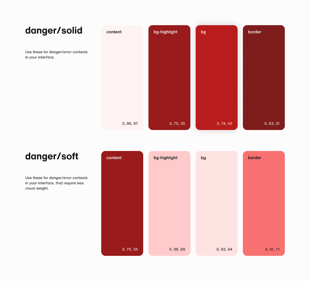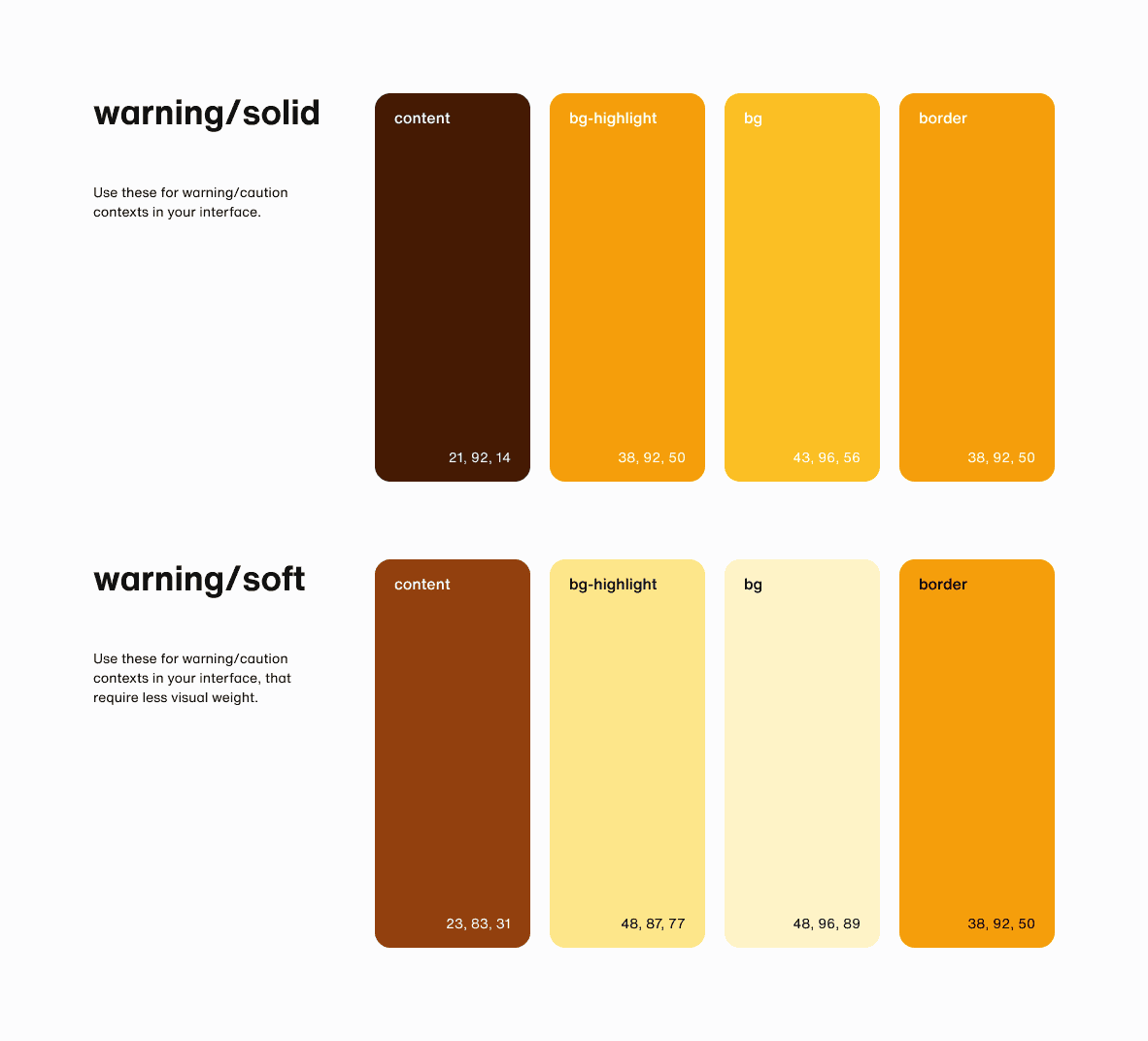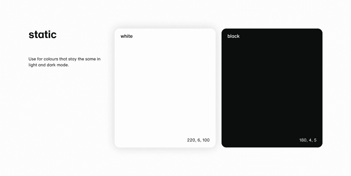 The colours used across light and dark modes are slightly different, but lack a consistent pattern in how they vary, shifting hue, saturation, or brightness in arbitrary ways.
