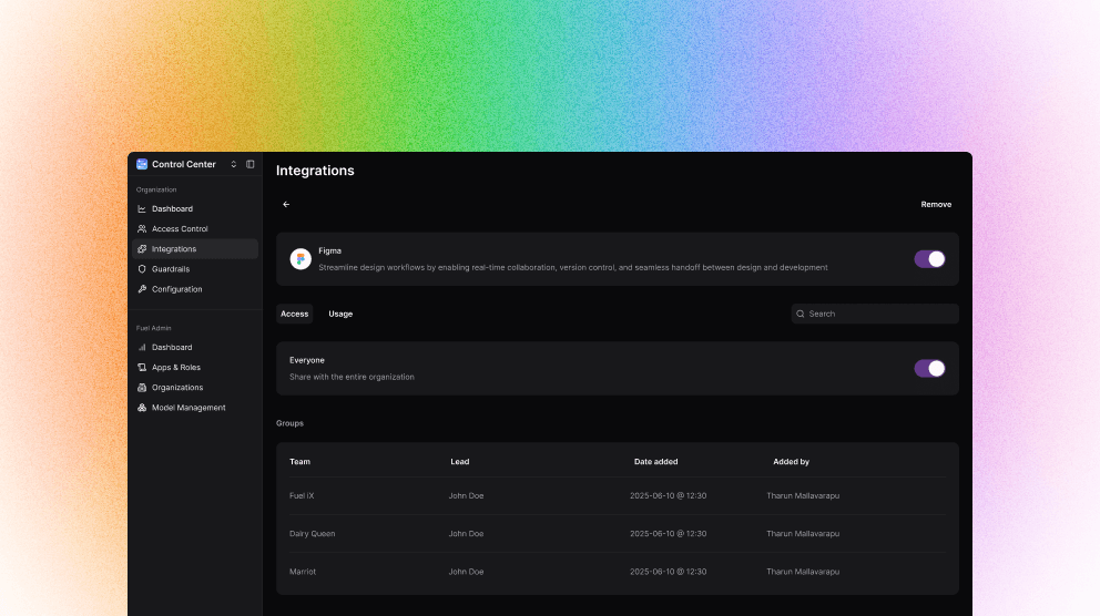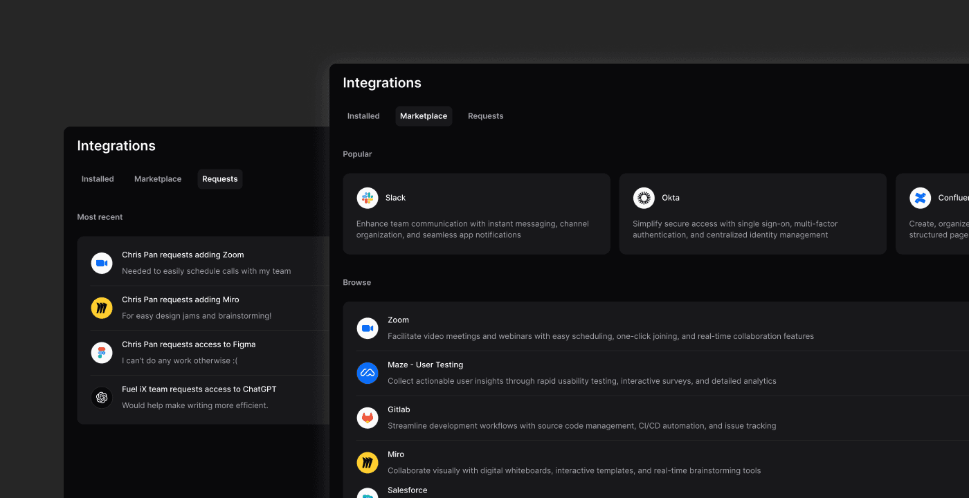 Movement was core to this design. High-fidelity prototypes explored how admins move between integrations, the marketplace, and app usage. Smooth, continuous transitions kept context while making the system feel fast and responsive.