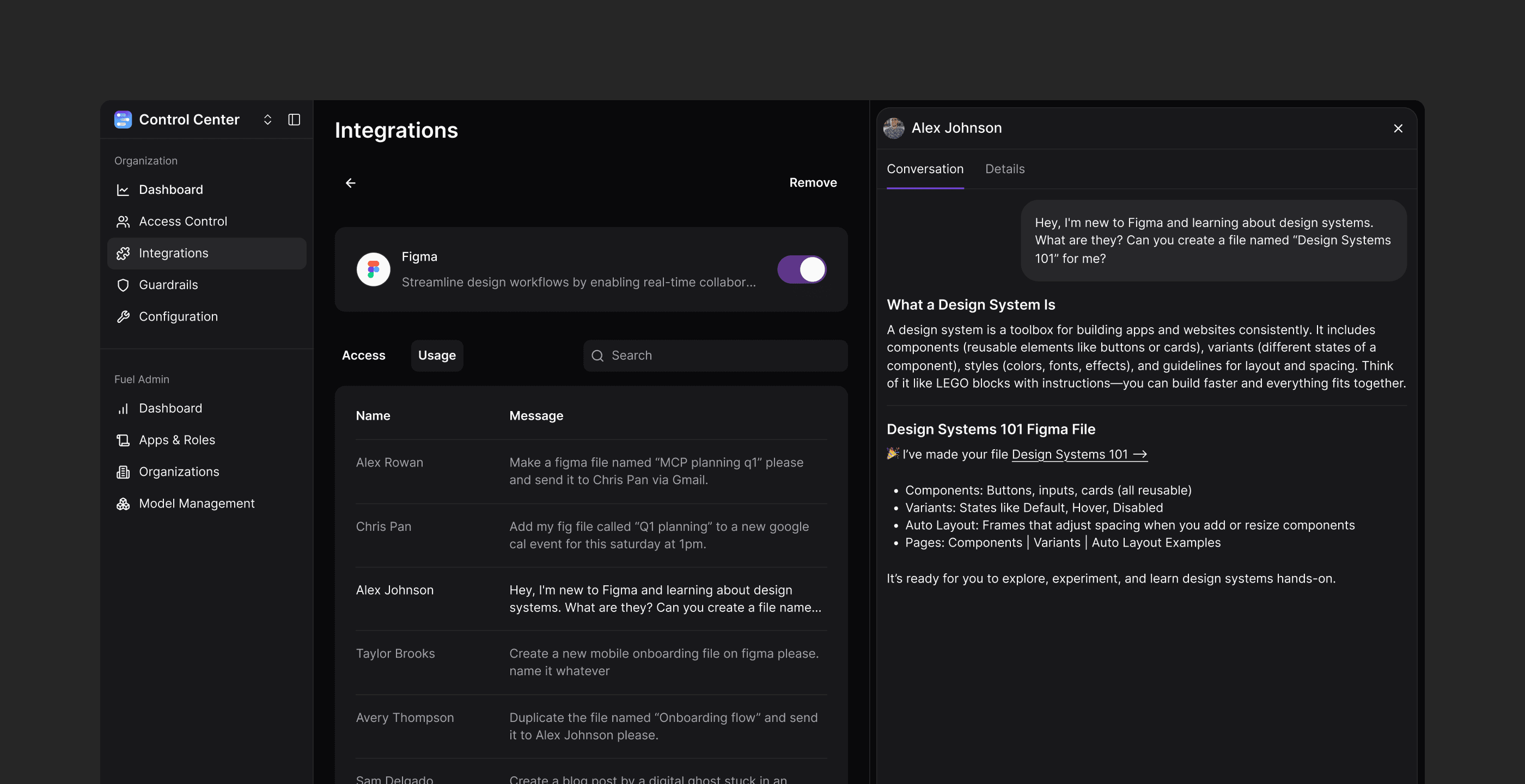 Admins can monitor individual/team usage of connected apps via MCP through a centralized, resizable panel that logs AI-initiated interactions, including the user, connected product, triggering message, and timestamp.
